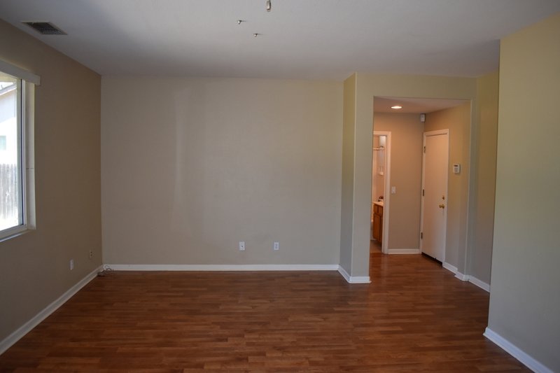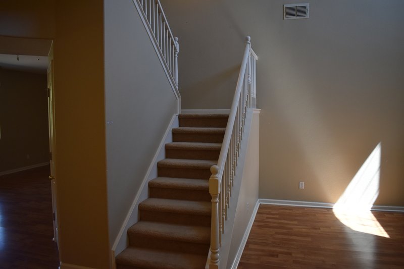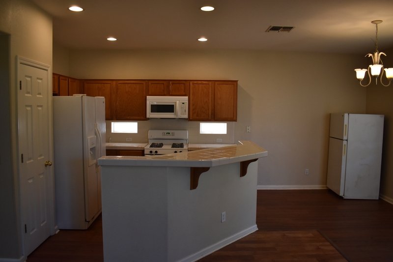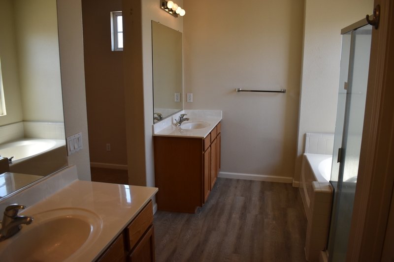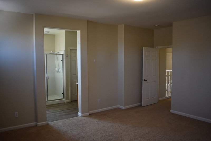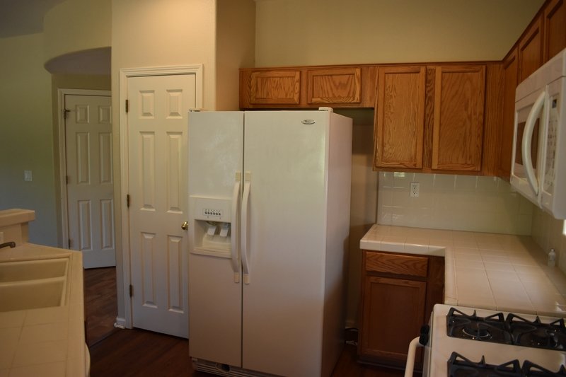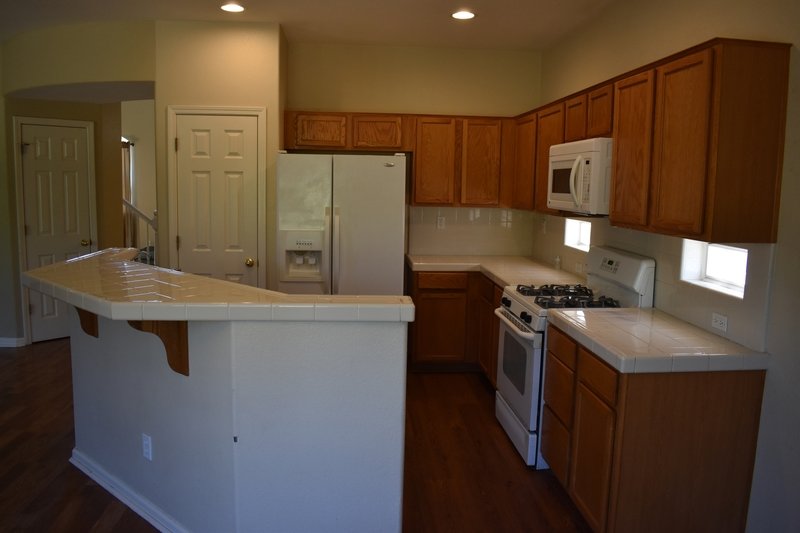 Available now. This house in North Merced features laminate flooring in the downstairs. The formal living room features vaulted ceilings. The kitchen features tile countertops with a gas cooktop, fridge included and pantry. One bedroom is located downstairs. The upstairs features carpet. The master bedroom features a walk in closet. The master bathroom features separate sinks, a tub and shower stall. The laundry room is located upstairs and features a washer and dryer. The backyard features a covered patio, concrete with fruit trees.